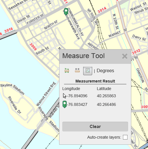 · As you move the mouse around the map, the Longitude and Latitude of the mouse’s location are displayed in the Measurement Result section next to the image of the mouse pointer