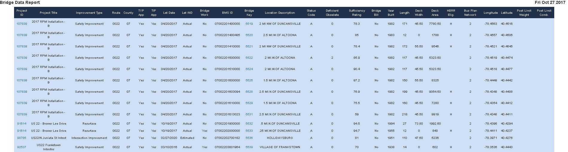 This is a basic report that lists information about bridges within the selected search area. Each Project ID and Bridge Key is a deeplink back to that ID in PennDOT One Map.