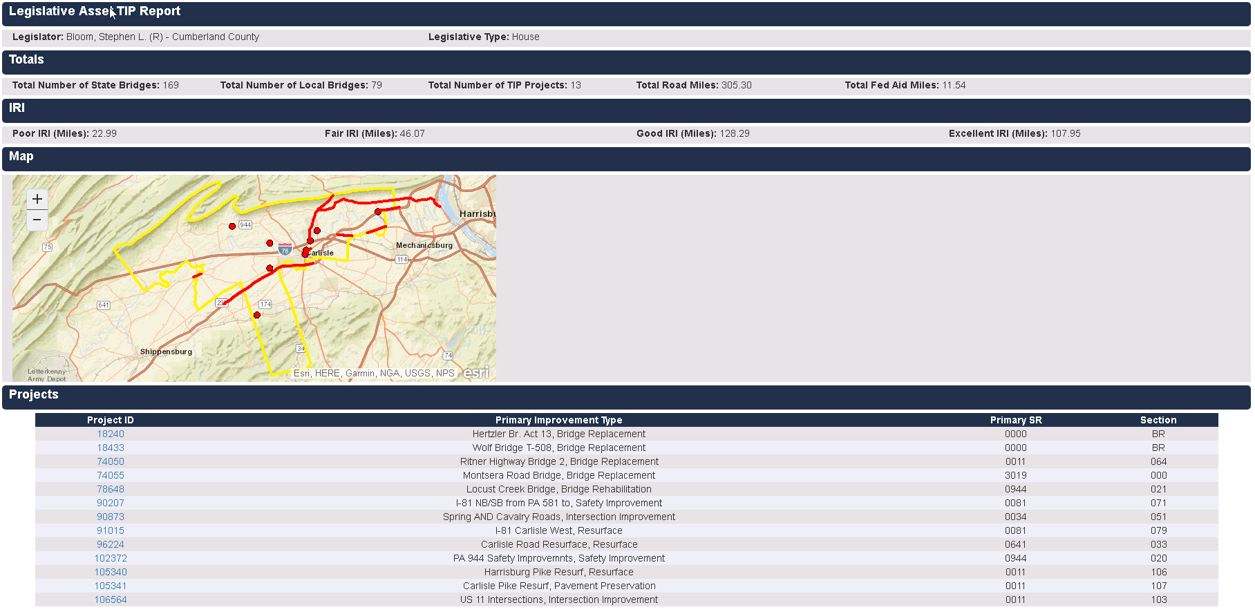 This report contains summary bridge and IRI information, as well as a list of projects for the selected Legislative District. The IRI miles for each IRI Rating, Total IRI miles, and the Federal Aid miles are also displayed. Each Project ID is linked in order to display the specific project within a map.