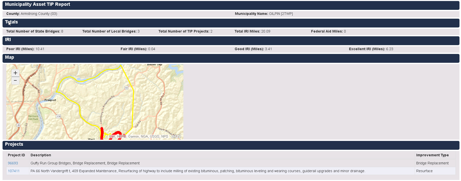 This report contains summary bridge and International Roughness Index (IRI) information, as well as a list of projects for the selected municipality. The IRI miles for each IRI Rating and Total IRI miles are also included. Additionally, each Project ID is linked in order to display the specific project within a map.