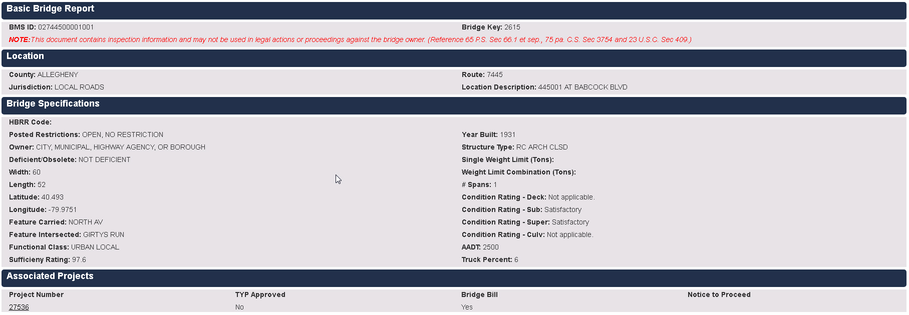 This report displays basic important information about the selected bridge. The associated projects section provides links to the individual project ID back in One Map.
