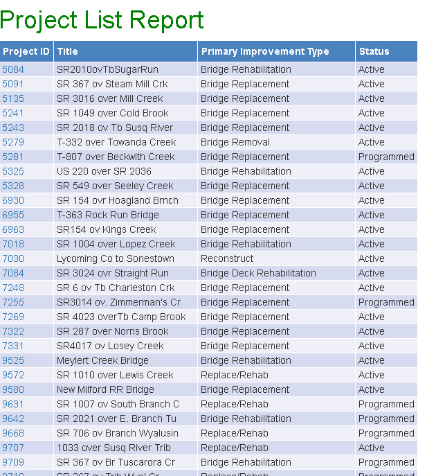 The Project Report List contains all projects displayed within the search area. It also lists the Primary Improvement Type and current Status of the project. Each Project ID is linked in order to display the specific project within a map.