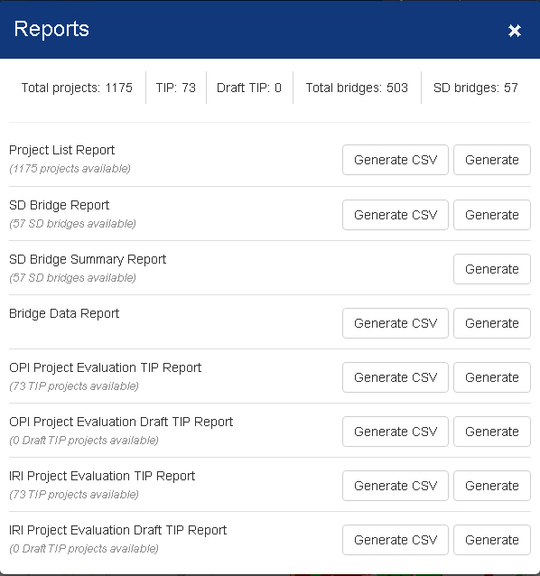The reports page allows you to select an available report based on the data displayed on the map. Any individual bridge, project or HOP report can be found at the bottom of the identify window that corresponds to the selected feature.