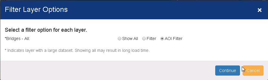 The Area Of Interest (AOI) filter in PennDOT One Map Allows you to use your existing AOI selection or add a filter when adding a layer or map from the Add Layer and Add map buttons in the header.