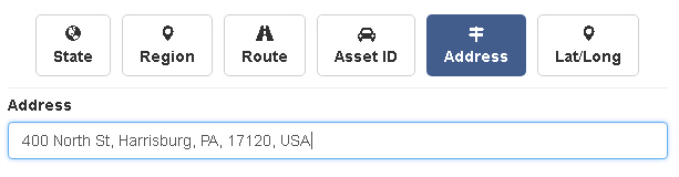 Address lets you find a specific street address on the map. Start typing and suggestions will appear below to help.