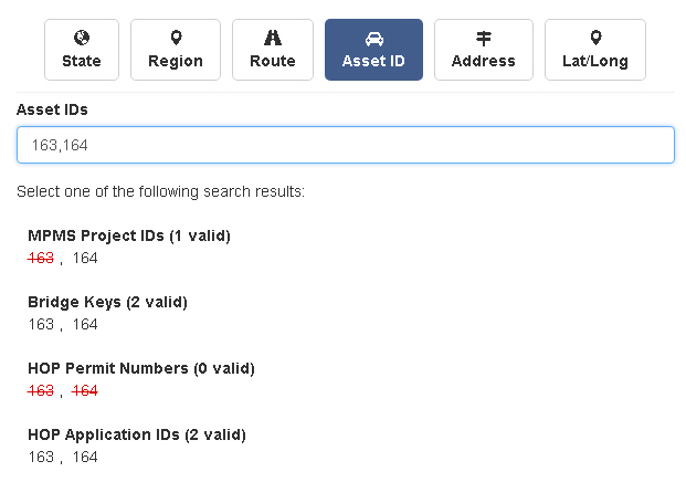Asset ID allows you to search by specific Bridge Key, Project ID, HOP App ID or HOP Permit Number. You can enter multiple comma or space separated numbers.