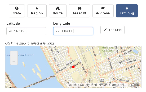 Search by Latitude and Longitude to pinpoint a specific location on the map. You can also click on the embedded map to set Lat/Long values.