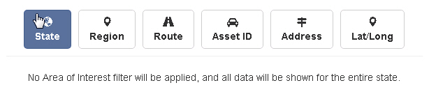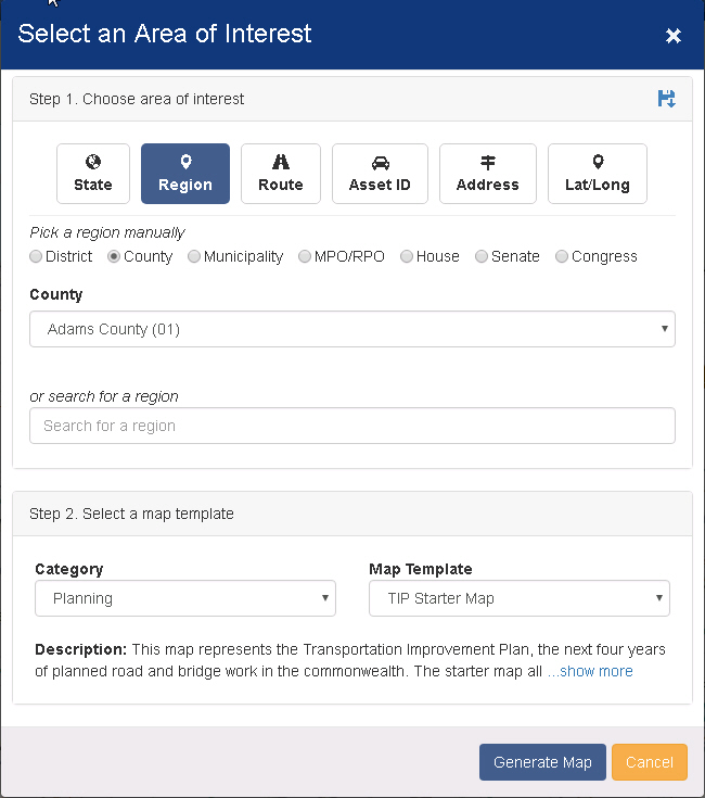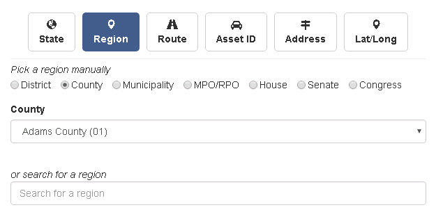 The Area Of Interest (AOI) Tool is the first thing that you see when PennDOT One Map loads. This tool is used to select the region or specific location that you would like to view, it can then filter any layers