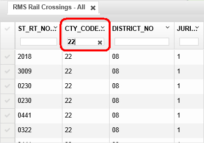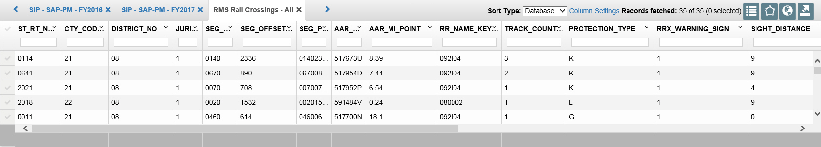 Each row represents a record in the data. In the sample above, each row shows data for an RMS Rail Crossing.
