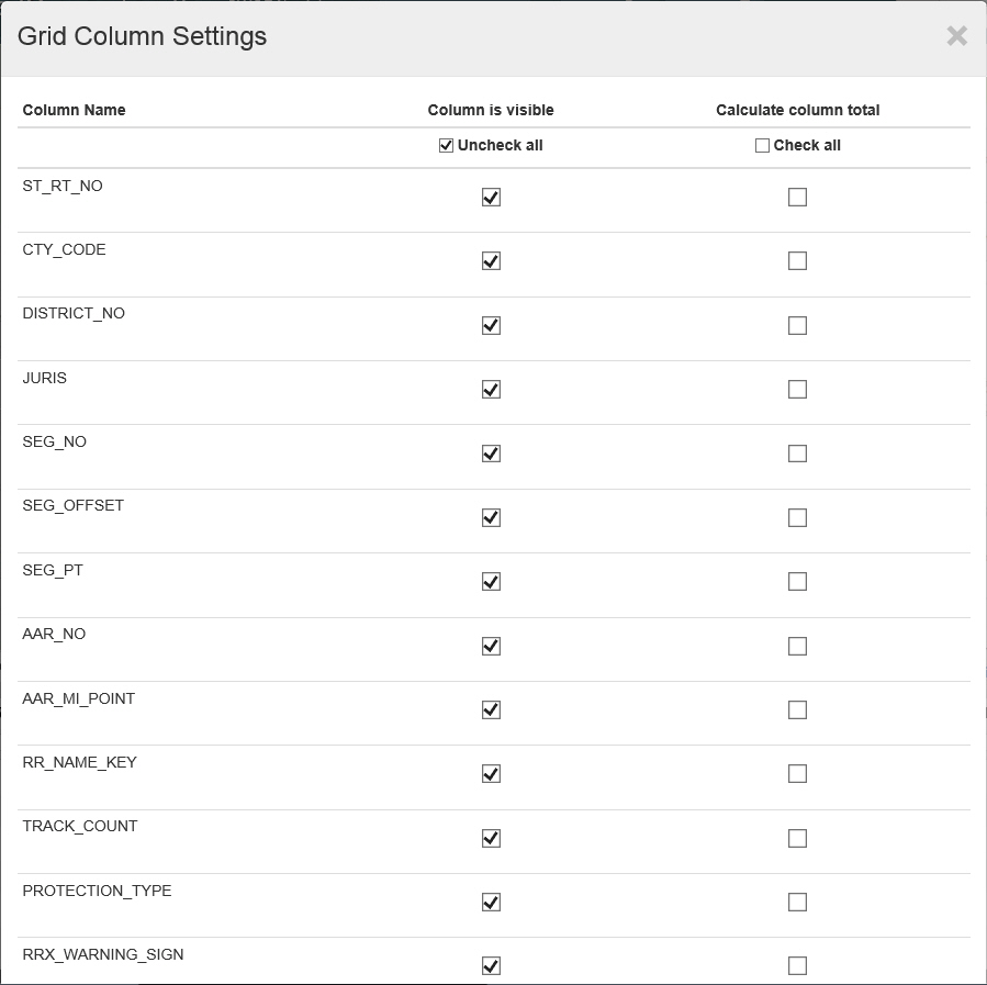 Column Settings - Click this link to display the Grid Column Settings window, which contains a list of all available columns. Select the columns you want to display under Column is visible and click OK. Columns not selected will be hidden. To get a sum of all values for a column, select the column under Calculate column total and click OK. The sum will appear at the bottom of the data table. PennDOT One Map will remember your customized settings.