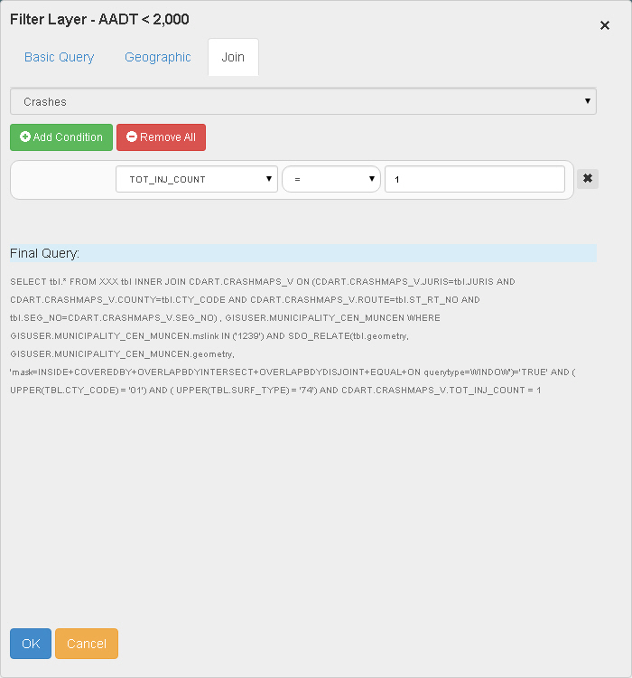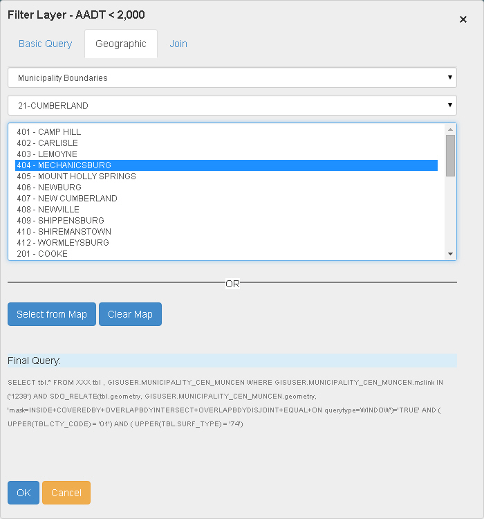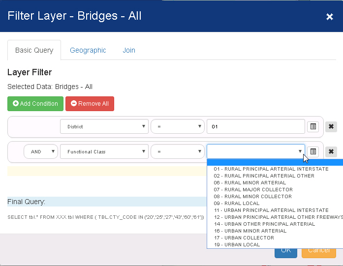 Caution: Use Geographic filters only when the appropriate attribute is not available in the Basic Query for the selected layer.