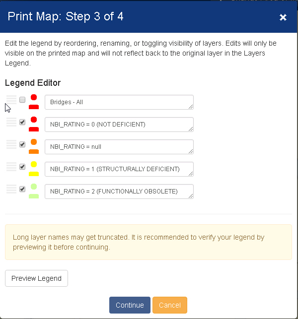 Step 3:The legend image to be printed on PDF can be edited by reordering, renaming, or toggling visibility of layers. Click Continue .