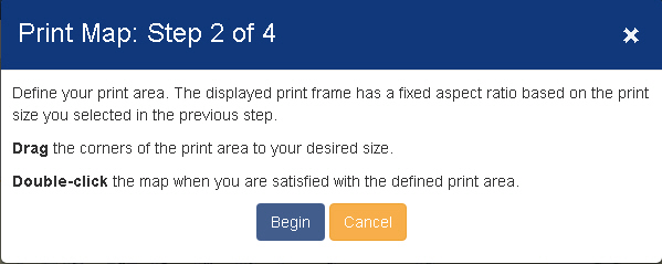 Step 2: Select the print area by hitting continue .Print extent box is drawn on the map and could be modified by dragging the corners of the print box. Print extent can be confirmed by double clicking anywhere on the screen.