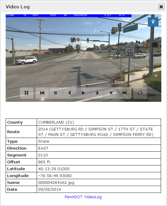 The Video Log window appears when you select Video Log from the Tools menu. It displays PennDOT's Video Log of the location indicated on the map.