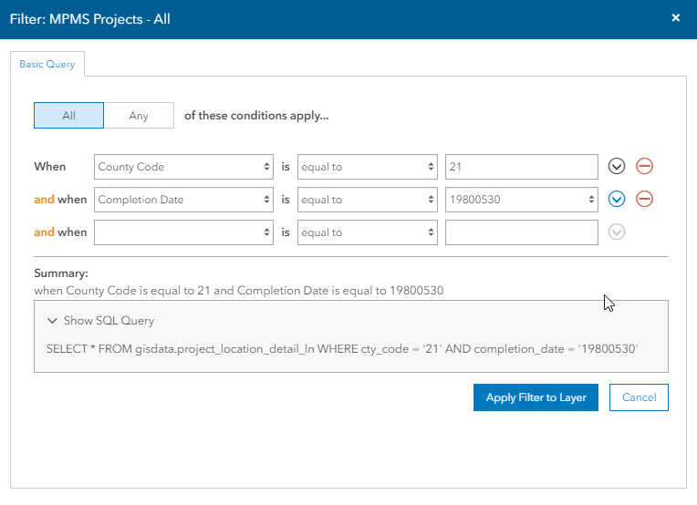 Use the Filter Layer window to narrow down a layer's features to show specific data, for example location, date range, or other characteristic.