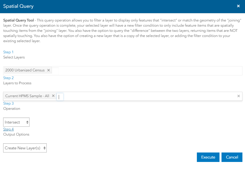 Execute:Starts to initiate the Spatial Query process and adds the newly created layer with new result on to the map.